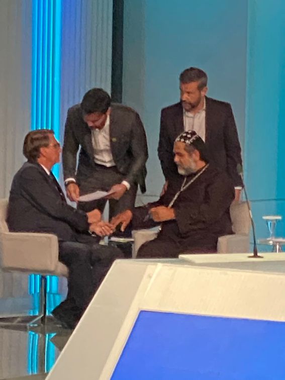 A foto mais parece Jair Bolsonaro recebendo a bênção de Padre Kelmon no debate da Globo