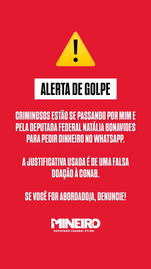A assessoria do deputado federal Fernando Mineiro (PT-RN) faz uma alerta nas redes sociais:
